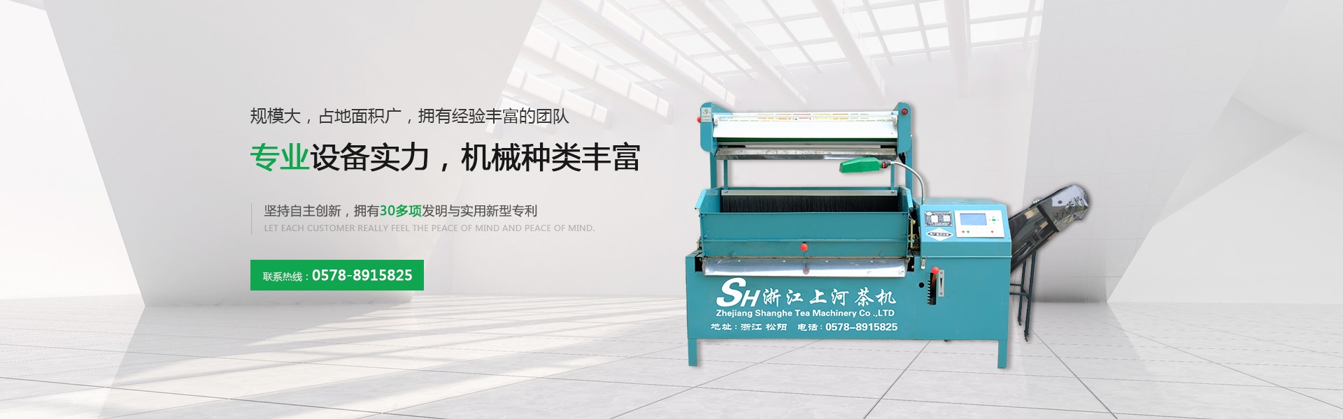 經(jīng)過多年的發(fā)展,浙江上河茶葉機械有限公司已成規(guī)模, 現(xiàn)占地面積13500多平方米,設(shè)備齊全。 主要產(chǎn)品有:6CCB系列全自動智能扁茶機、6CL系列全自動智能茶葉理條機、6CH系列茶葉輝干機等10多種機型。